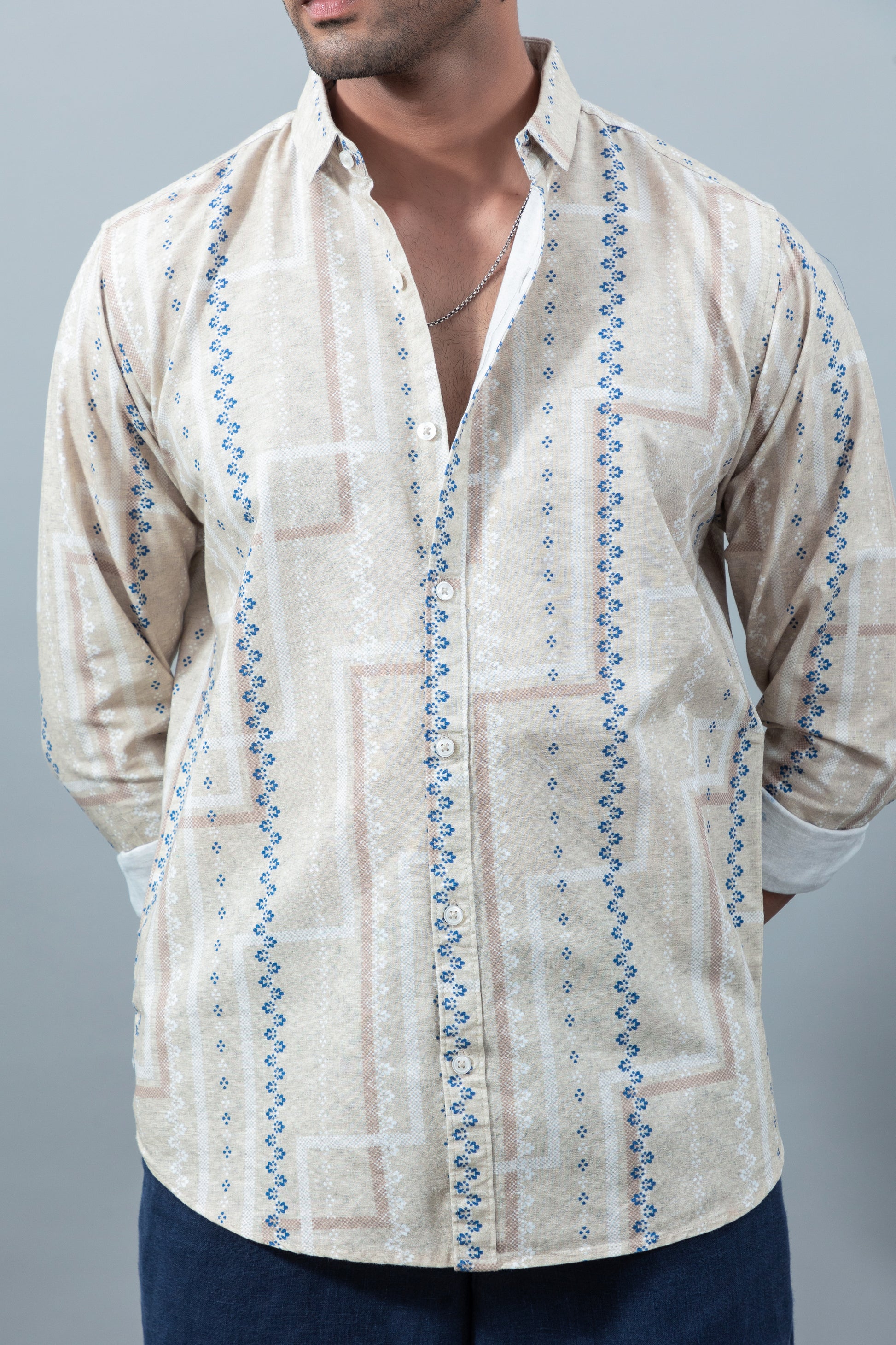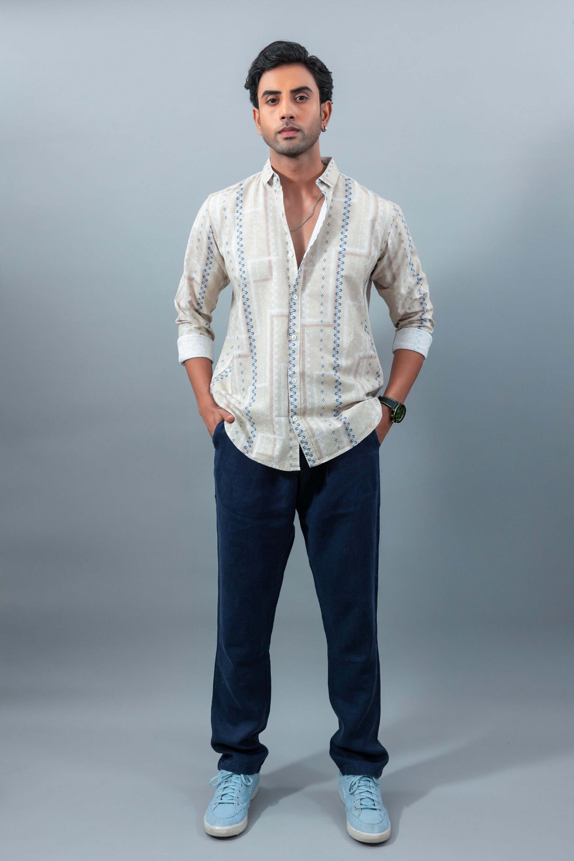 | This full-sleeve beige shirt is crafted from a breathable 85% cotton and 15% linen blend, finished with a soft bio wash for added comfort. Featuring a subtle print, tailored fit, it’s an ideal choice for relaxed yet polished smart-casual wear. Size & Fit: Fit: Tailored Fit Size: model is wearing size L, model height is (6.0 feet) Wash Care: Machine wash Specification: Casual wear 85% cotton 15% linen Casual collar Printed Note : The actual colour of the product may vary slightly due to photographic lighting sources or your device's screen. |